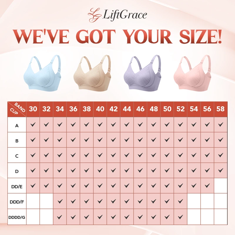 From petite to plus, we believe no one should compromise on comfort. That’s why we offer our widest range ever: Bands 30-58 and Cups A-G. No matter your measurements, you can finally find the precise, hug-free fit that feels like it was made just for you.